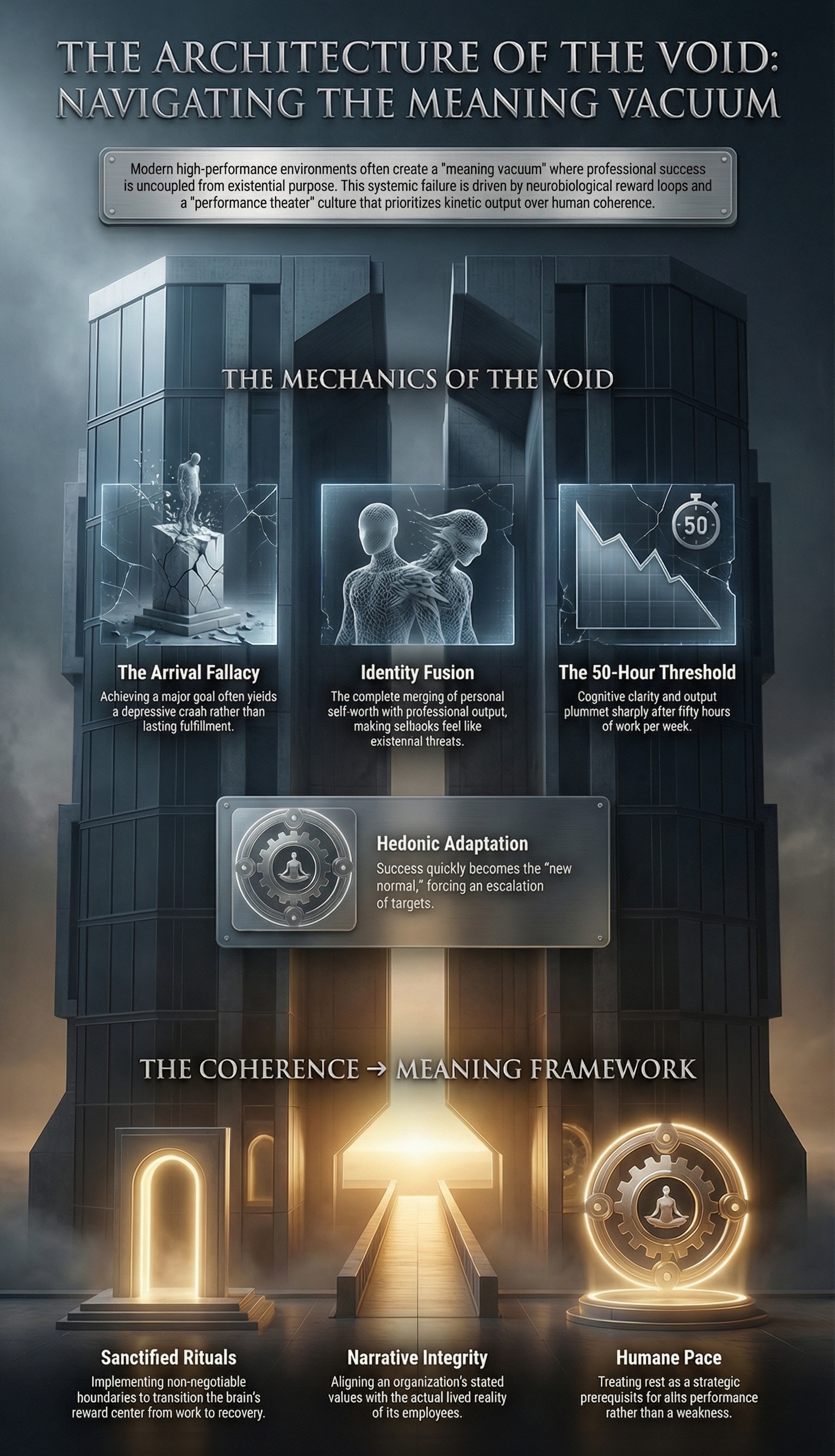 The modern meaning vacuum is the inevitable, catastrophic consequence of systems that attempt to extract infinite kinetic energy from finite human architecture. When the ancient neurobiology of reward is hijacked by ever-moving goalposts, when personal identity becomes dangerously and inextricably fused with corporate output, and when the sociology of the workplace demands relentless, exhausting theatrical performance, success itself transforms into a mechanism of profound spiritual and psychological exhaustion.